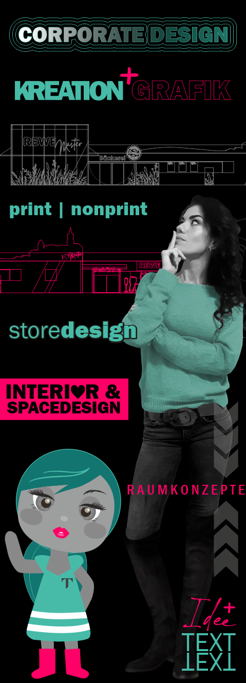 2012 zog es mich dann in die Werbetechnik mit Fullservice. Das heißt, klassische Grafik- und Agenturleistungen + Werbetechnik mit Inhouse-Produktion. Entsprechend erweitert hat sich damit auch das Know-How und Portfolio. Als kreativer Allrounder entwerfe und entwickle ich seit mittlerweile 20 Jahren daher alles, was sich ein Kundenherz so ausdenken und wünschen kann und betreue meine Projekte ganzheitlich. Von A wie Aufmaß bis Z wie Zeitmanagement und ziemlich tolles Ergebnis;) Ob Logo, Corporate Design, Printwerbung, Storedesign, Raumkonzept, POS-Konzeptentwicklung, Katalog, Messeauftritt, Beschriftung, Lichtwerbung oder Sonderbau – ich mach das…mit Leidenschaft!